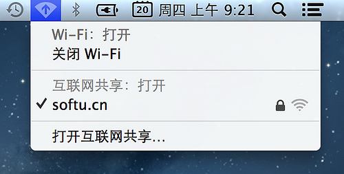 当将Mac作为Wi-Fi热点时,菜单栏上的Wi-Fi图标会变成一个向上的箭头,表示开启Wi-Fi共享,点击即可查看Wi-Fi热点的名称和打开互联网共享等。
