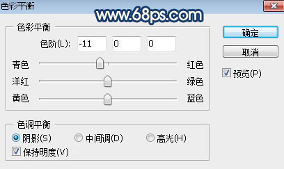 3、创建色彩平衡调整图层,对阴影进行调整,参数设置如图7,效果如图8。这一步减少图片暗部区域红色。