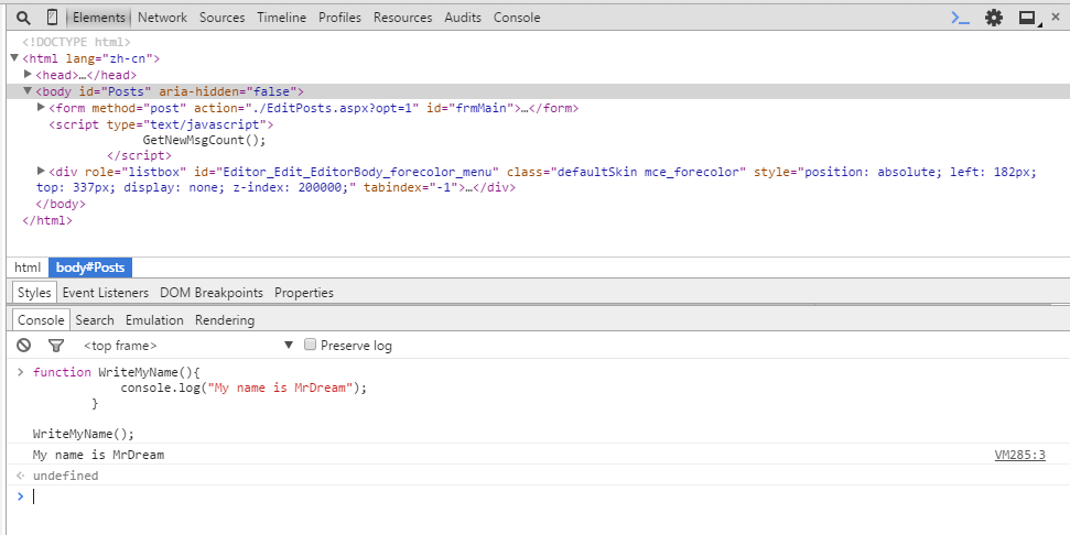 前面我用function关键字声明了一个函数WriteMyName,在方法体里面我只写了一句简单的console.log("My name is MrDream"),然后,直接用函数名加一个括号