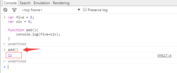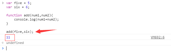 函数体里面仍然是一句打印语句,打印的结果是11,5+6=11,没有错吧,如果我们要做其他值的加法,怎么办呢?是不是要修改变量呢,对了,前面的var就是用来声明变量的关键字,我们声明了一个five和一个six,并且给他们赋值,然后,打印这两个变量相加。