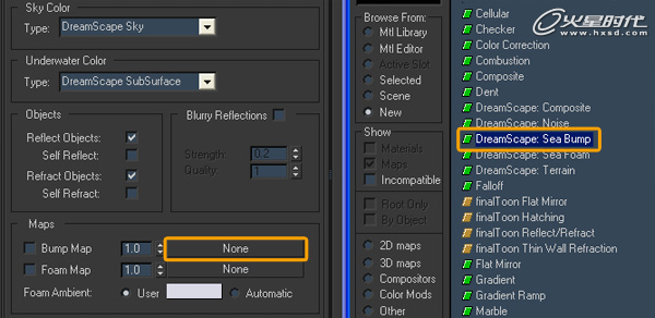 在Bump Map中,添加一个DreamScape: Sea Bump,添加更多细节的浪潮。(图18)