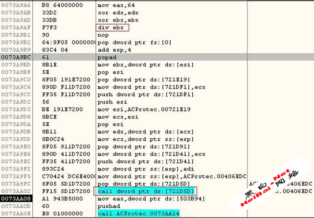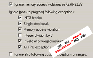 可以看到(跟一下可以证实),在call入原程序空间前,最后的异常是div 0。用现在的OllyDbg脚本(跟到737B63),停下后修改异常拦截选项: