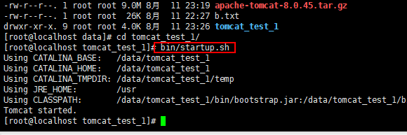 当然你也可以选择修改 Tomcat 的名字,命令:mv(此处有空格)apache-tomcat-8.0.45(此处也有空格)tomcat_test_1