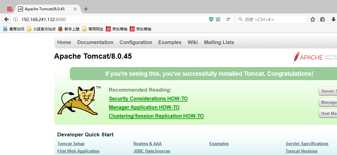 然后再在浏览器里输入虚拟机的 ip 地址加 8080 就可以看到 Tomcat 的标识了:
