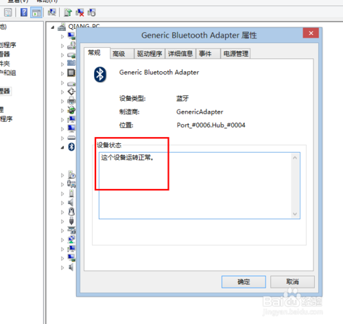 右击计算机——管理——打开设备管理器,在设备管理器中有一个蓝牙,展开看看蓝牙的驱动是否安装正常即可。右击驱动——属性——这个设备运转正常就可以。