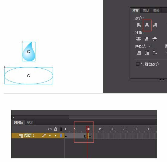 7、在第10帧,选择椭圆工具,画1个水波, 选中这个物体,设置成如图颜色#3BC8F7。选中这个物体,按F8键,转换为元件。在第10帧将水波和水滴的位置移好。按ctrl+k垂直对齐。在第11帧,按F7插入1个空白帧,然后将前1帧的水波剪切到11帧。黏贴的时候按ctrl+shift+v原位置黏贴。如图。在第10帧画上水波,就是为了确定水波的位置。