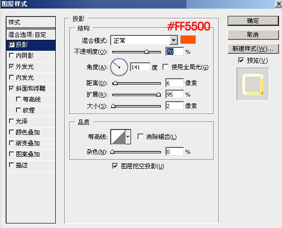 投影:颜色为橙红色:#ff5500,混合模式“正常”,其它设置如下图。