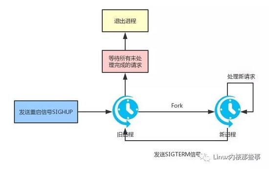 从原理图可以知道,重启时首先通过发送 SIGHUP信号 给服务进程,服务进程收到 SIGHUP信号 后会 fork 一个新进程来处理新的请求,然后新进程会发送 SIGTERM信号 给旧服务进程(父进程),旧服务进程接收到 SIGTERM信号 后会关闭监听的 socket句柄 (停止接收新请求),并且等待未处理完成的请求完成后再退出进程。