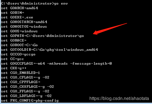 从命令行输出中,可以看到 GOPATH 设定的路径为:C:UsersAdministratorgo
