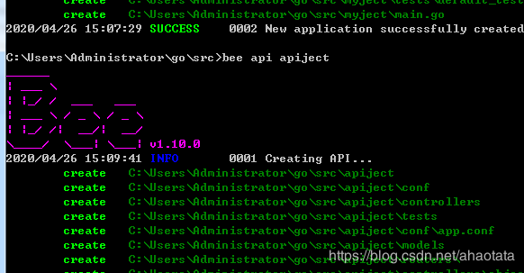 上面的 new 命令是用来新建 Web 项目,不过很多用户使用 beego 来开发 API 应用。所以这个 api 命令就是用来创建 API 应用的,执行命令之后如下所示: