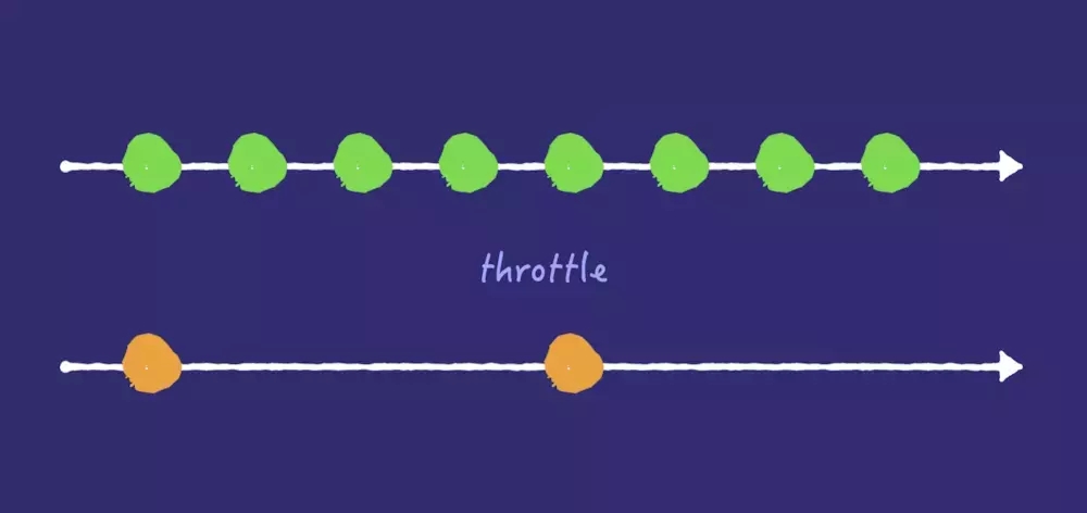 可以理解为事件在一个管道中传输,加上这个节流阀以后,事件的流速就会减慢。实际上这个函数的作用就是如此,它可以将一个函数的调用频率限制在一定阈值内,例如 1s,那么 1s 内这个函数一定不会被调用两次