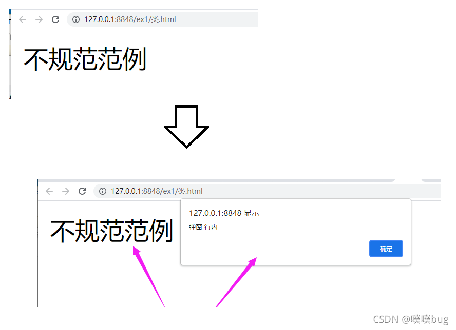 <div onclick = "alert('弹窗 行内');">不规范范例</div>