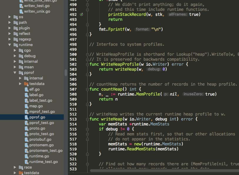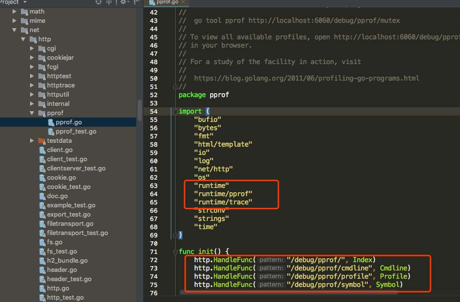 pprof有两个包用来分析程序一个是net/http/pprof另一个是runtime/pprof,net/http/pprof只是对runtime/pprof包进行封装并用http暴露出来,如下图源码所示: