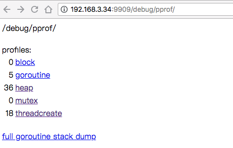 运行程序,通过访问 http://192.168.3.34:9909/debug/pprof/可以查看web版的profiles相关信息