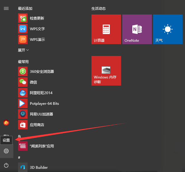 1、点击开始菜单中的设置按钮