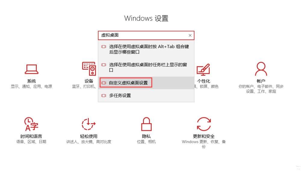 2、搜索"虚拟桌面",选择“自定义虚拟桌面设置”