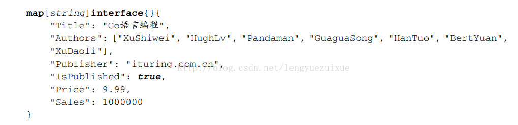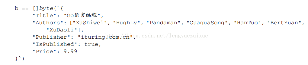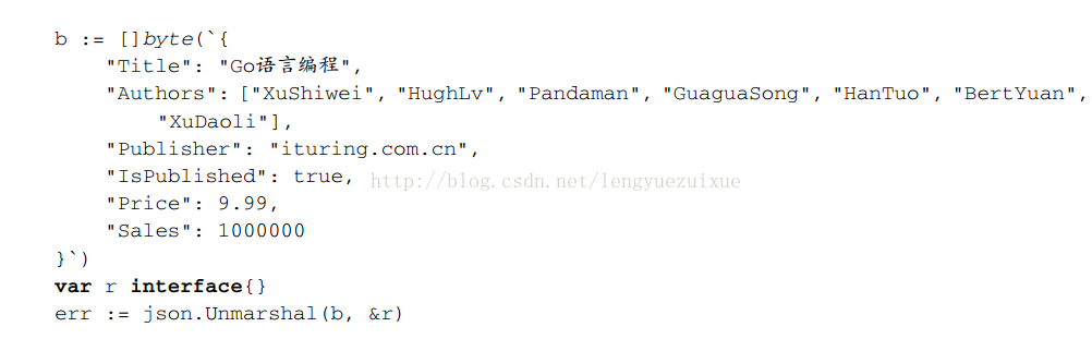 如果b是一个有效的JSON数据并能和book结构对应起来,那么JSON解码后的值将会一一存放到book结构体中。解码成功后的book数据如下: