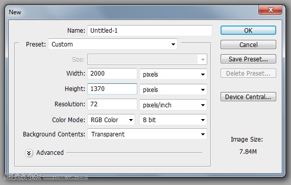 一、创建一个2000*1370像素的文件,颜色模式为RGB,分辨率为72DPI。