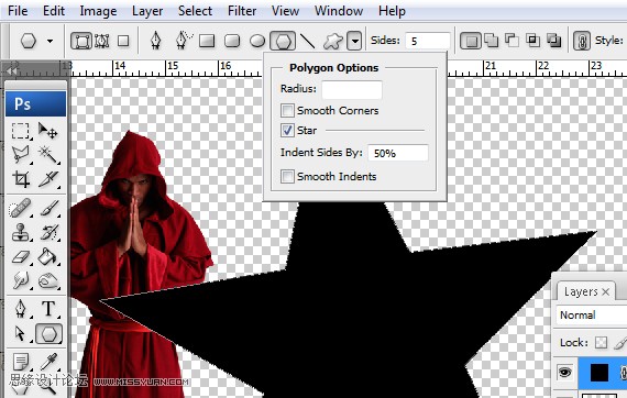 五、单击多边形工具(U),选项栏设置为形状图层,设置边数为5,打开选项菜单,勾选星形,绘制一个五角星。