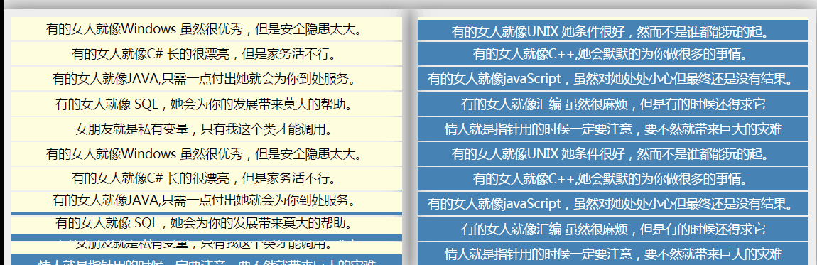 如图所示,空心格子就好比是每个li,给它设定相对定位属性,设置overflow:hidden;黑块为li子元素,高度为li的2倍,设置absolute属性,我们正是要改变它的top值从而获得变化!(右上角多余块与本图无关)