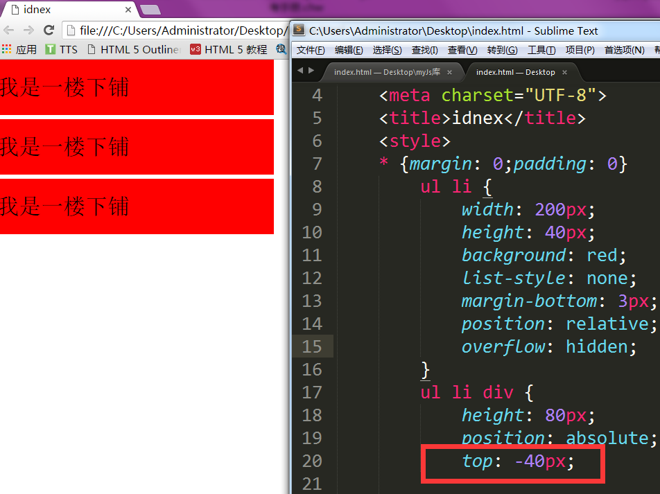 注意top值得变化!默认top=0时候,显示的“一楼上铺”,当top=-40px时候,li的子元素 上移40px,这时候显示的内容就为“一楼下铺”注意p元素的包裹层div