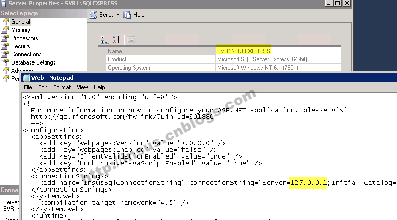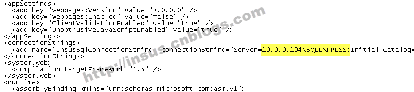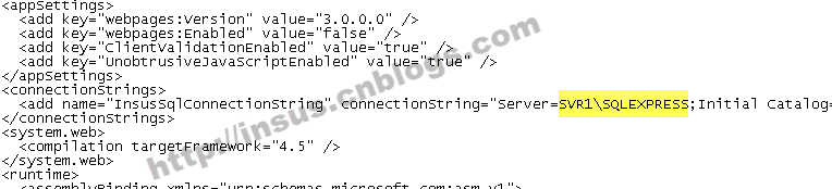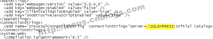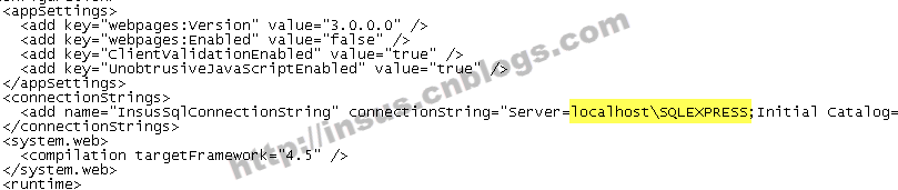 Insus.NET开发时,数据库是使用企业版,因此连接字符串就是写成默认的实现,而现在部署的数据库是\SQLEXPRESS。所以我们修改一下连接字符串: