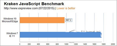 大家可以看到微软Edge浏览器的性能是如此的抢眼,面对IE11是完胜,在Octane 2.0 JavaScript Benchmark这个项目上微软Edge领先幅度超过了50%!Kraken JavaScript Benchmark这个项目的优势也将近50%,新的浏览器表现相当值得期待。