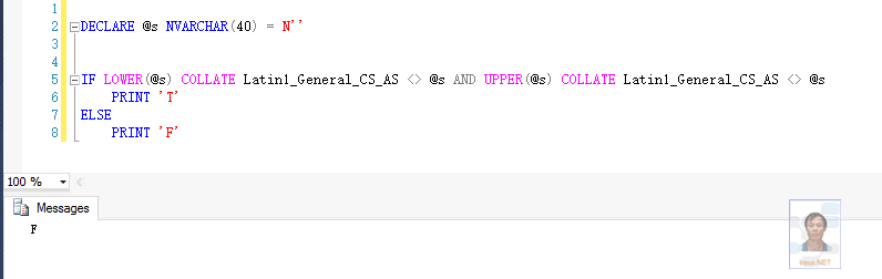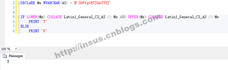 DECLARE @s NVARCHAR(40) = N'SDFfgGRYJhhTYUJ' IF LOWER(@s) COLLATE Latin1_General_CS_AS <> @s AND UPPER(@s) COLLATE Latin1_General_CS_AS <> @s PRINT 'T' ELSE PRINT 'F'