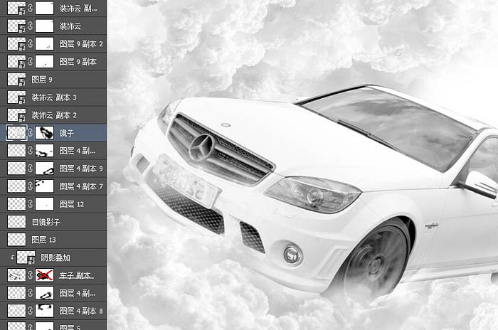 7、场景中的云和汽车就位置基本融合了。来处理环境关系,我们这里给汽车的玻璃添上反射的云朵画面,让它更加逼真。直接用蒙版擦拭就可以了。