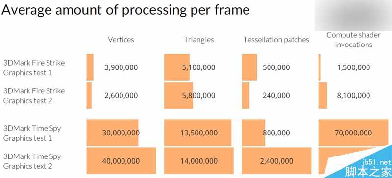 它在两轮图形测试中,每一帧都会处理海量的数据,具体包括3000万和4000万个顶点、1400万和1350万个三角形、240万和80万个曲面细分,7000万和7000万个计算着色,都是Fire Strike的几十甚至上百倍。