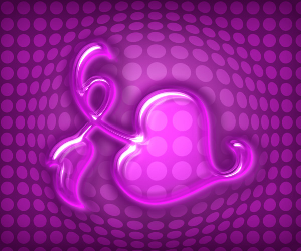 教程分为两个大的部分:背景和水晶心形。背景先用渐变色填充,然后填充自制图案,再用滤镜等做一些变形处理;心形部分制作稍微复杂一点,用到多个图层,分别控制高光、暗部、细节等,用图层样式来完成。