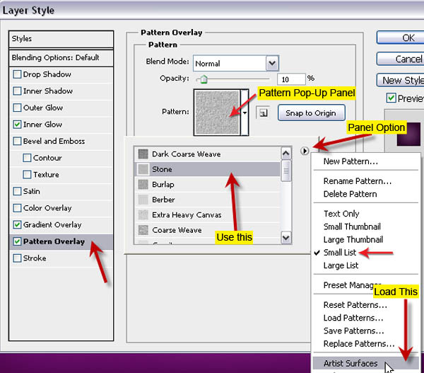 3、单击左侧栏中的“图案叠加”。点击图案右侧的小三角,调出图案选项,在选项设置中,选择“艺术表面”“小列表”,然后在图案列表选项中选择“石头”模式。