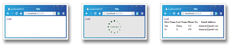 Ajax在Web应用中使用得越来越频繁。在进行Ajax调用过程中一般都具有这样的做法:显示一个GIF图片动画表明后台正在工作,同时阻止用户操作本页面(比如Ajax请求通过某个按钮触发,用户不能频繁点击该按钮产生多个并发Ajax请求);调用完成后,图片消失,当前页面运行重新编辑。以下图为例,页面中通过一个Load链接以Ajax请求的方式加载数据(左)。当用户点击该链接之后,Ajax请求开始,GIF图片显示“Loading“状态,同时当前页面被“罩住”防止用户继续点击Load按钮(中);Ajax请求完成被返回响应的结果,结果被呈现出来的同时,GIF图片和“遮罩”同时消失(右)。