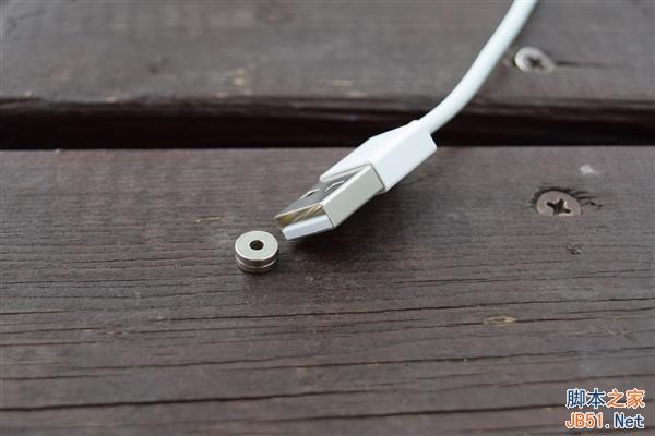 先测试一下小米MFi Lightning线 USB公头的壳体材质,这里使用的是强力磁铁,距离3mm时居然没有被吸附,但是靠近后还是感觉到磁吸(外壳镀镍所致),刮开后看到铜壳,USB的四根针能看到金色电镀层。再来看下Apple iPad mini原装数据线USB公头测试,磁铁吸附感觉跟上面的一样,可见内部用料有相似之处。