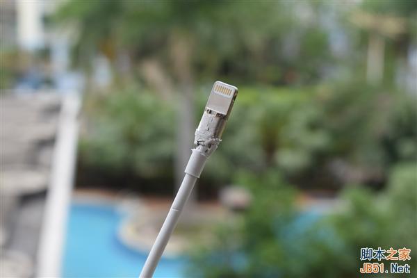 先剥开Lightning头的塑胶外壳,露出金属屏蔽层,全包裹起到保护的作用。