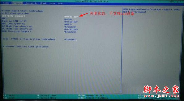 2、接着通过键盘上的左右方向键切换到“Advanced”界面,可以看到USB BIOS Support当前处于“Disabled”状态,这代表不支持usb设备,如下图所示: