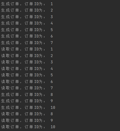 这里如上面逻辑类似,不同的是用一个,OrderInfo结构体模拟订单作为业务处理对象。主线程使用time.Sleep(time.Second * 2)阻塞,否则,程序立即停止。