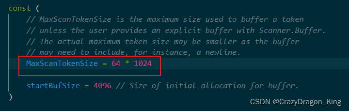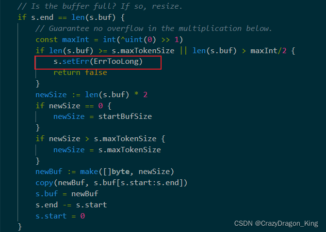 通过阅读Scan()函数的源码,我们可以发现这样一个判断,如果buf的长度大于了最大token长度,那就会报错,见下图。