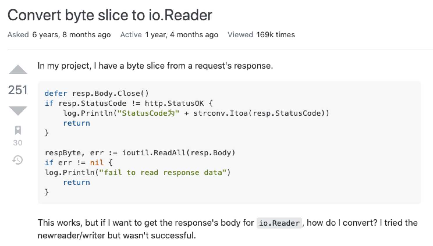 在 stackoverflow 上看到一个问题,题主进行了一个网络请求,接口返回的是 []byte。如果想要将其转换成 io.Reader,需要怎么做呢?