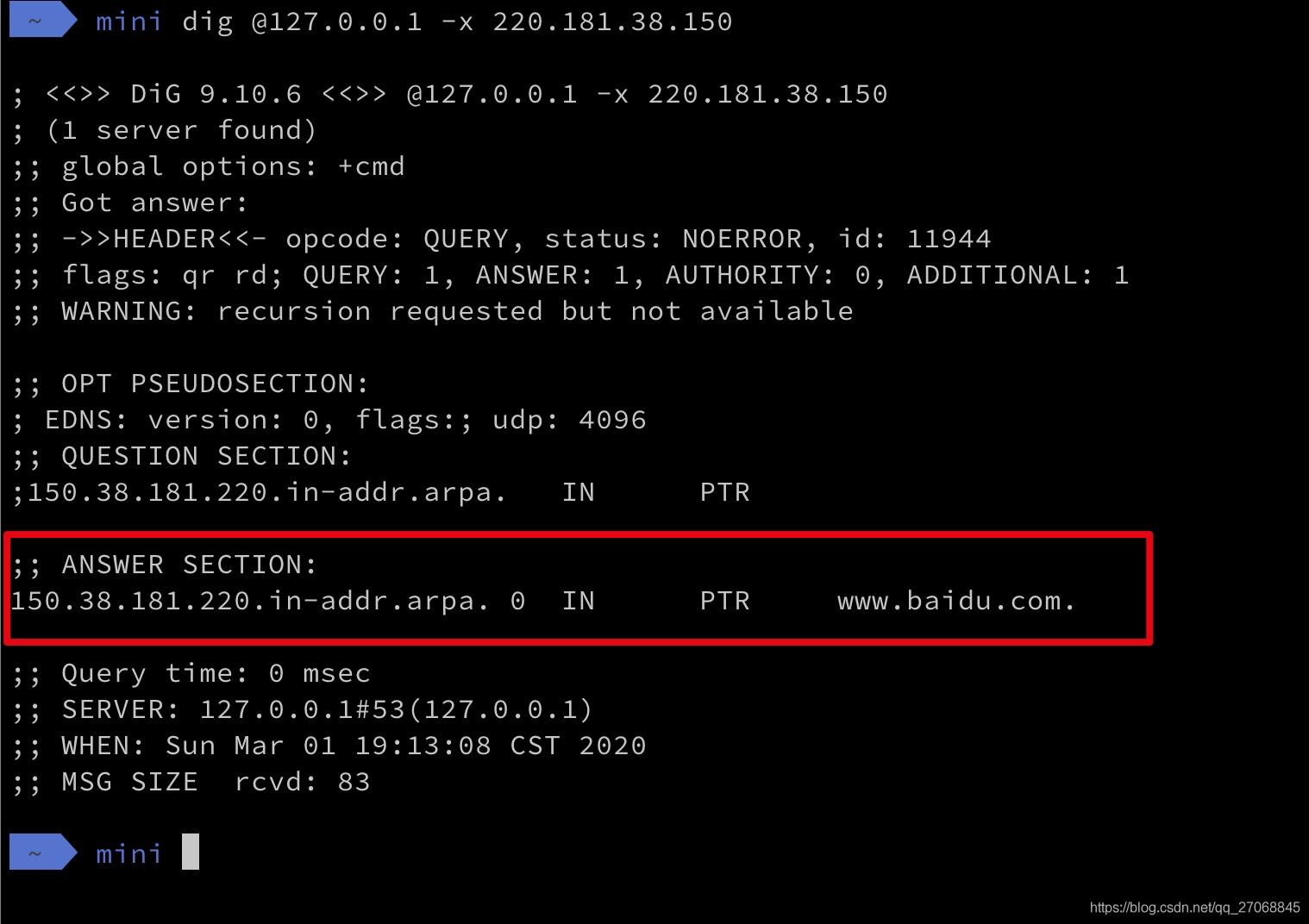 命令:dig @127.0.0.1 -x 220.181.38.150