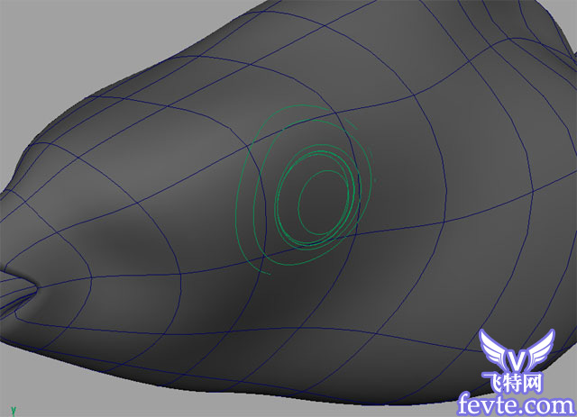 4 、我们再做鱼的眼睛。我们先大概确定眼睛的位置,建个 Nurbs-Circle ,将它影射到刚做好的鱼体上,再根据 Nurbs-Circle ,多复制几个 Circle ,分别放大缩小调整距离,最后进行 loft (放样)