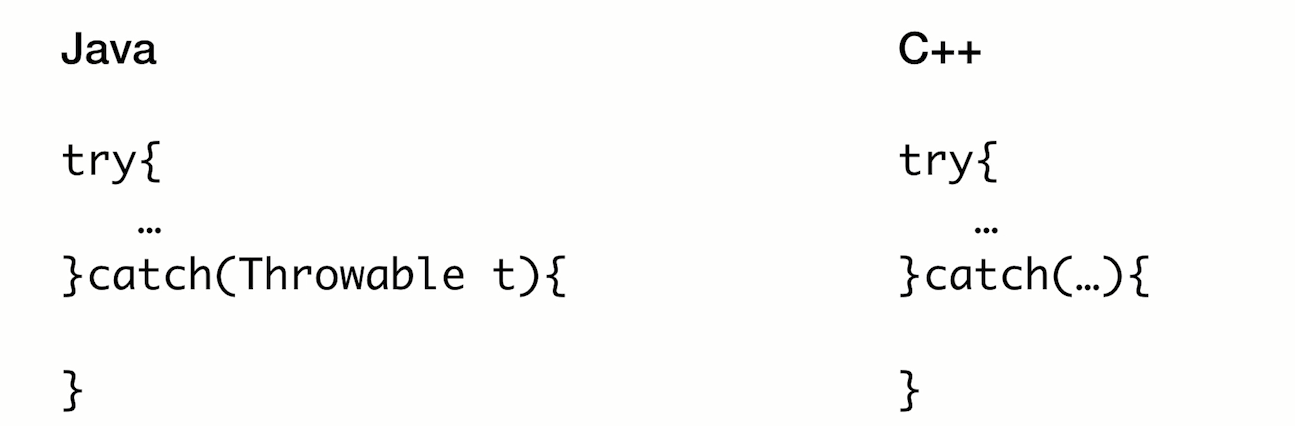 在Java中如果你不知道要抛出什么错误,于是乎很多人直接来个Catch Throwable,作为一个异常无Fack说,C++中是直接catch…作为一个异常无Fack说