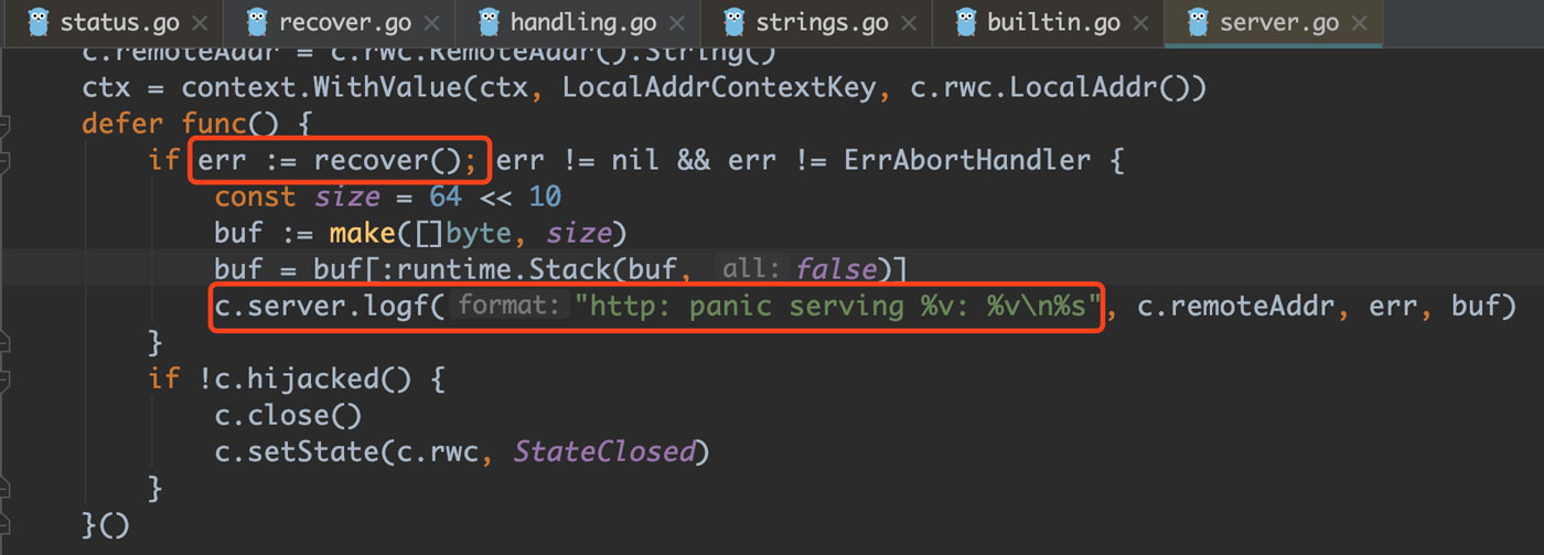 原来server.go已经帮我们recover了, recover后并不是中断进程, 而是打印输出错误日志. 虽然如此, 但页面显示依然很难看. 因此我们要做两件事