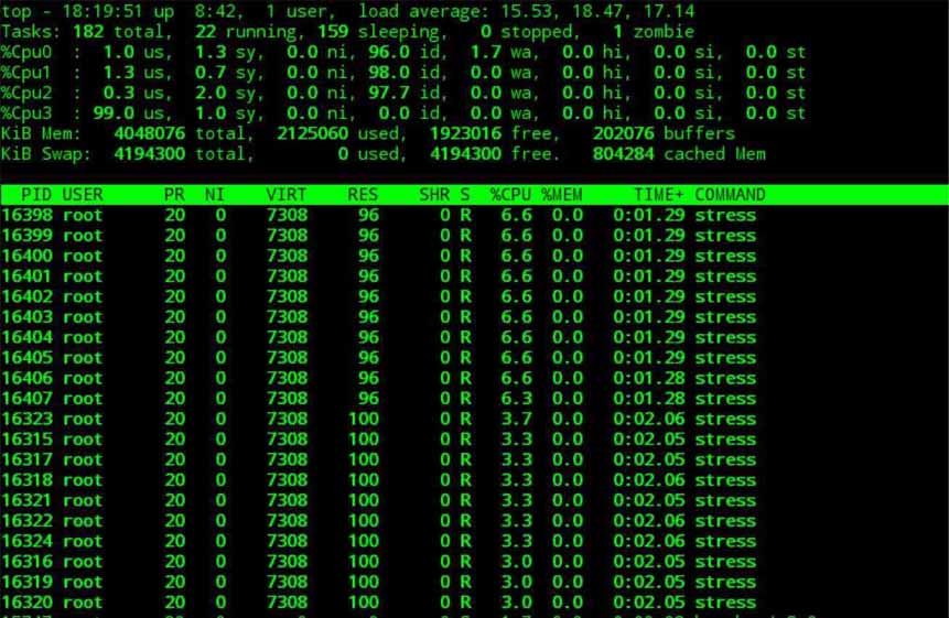 上面的ubuntu:stress镜像安装了stress工具来测试CPU和内存的负载。两个容器的命令stress -c 10&,这个命令将会给系统一个随机负载,产生10个进程,每个进程都反复不停的计算由rand()产生随机数的平方根,直到资源耗尽。