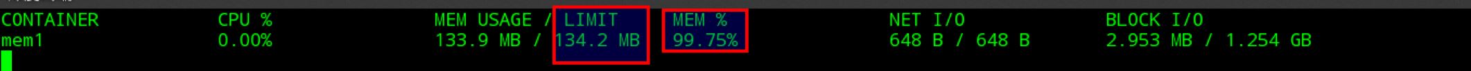 可以发现,使用256MB进行压力测试时,由于超过了内存上限(128MB内存+128MB swap),进程被OOM杀死。使用250MB进行压力测试时,进程可以正常运行,并且通过docker stats可以查看到容器的内存已经满负载了。
