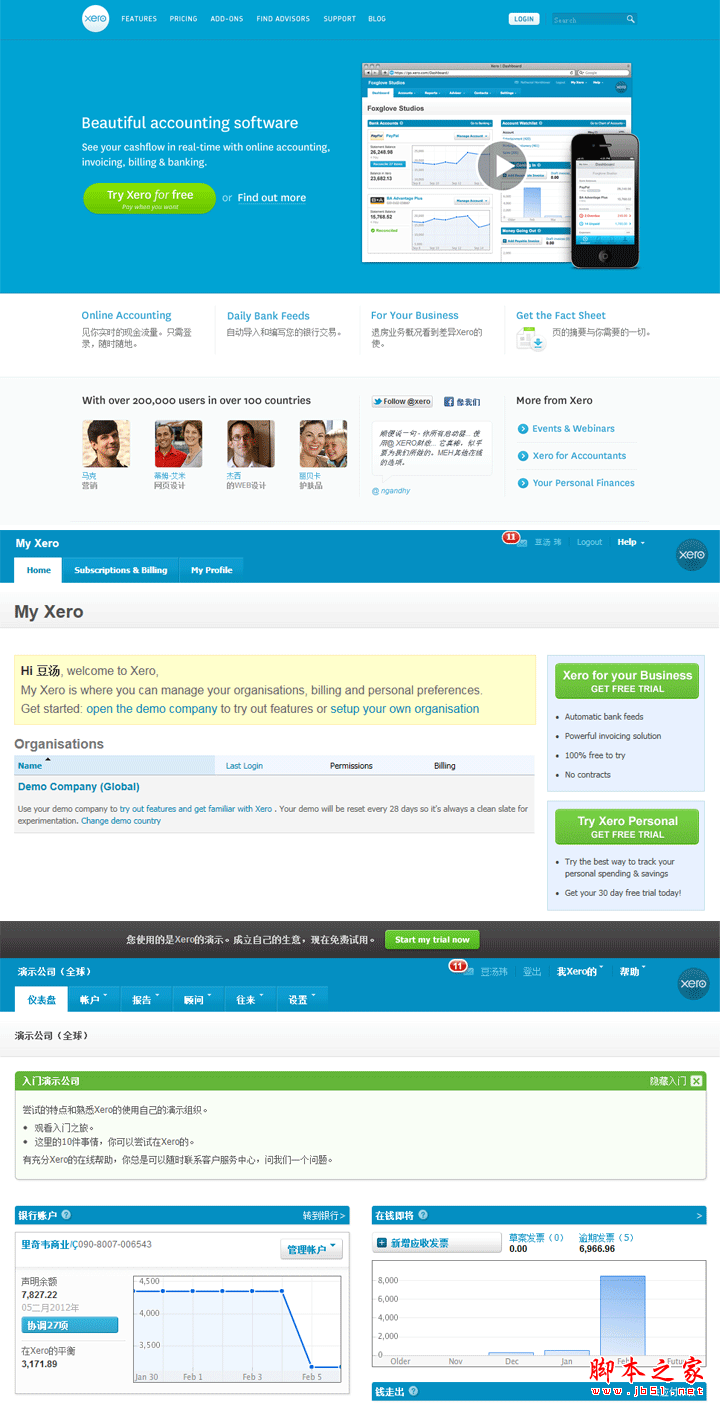 在信息展示方面,Xero门户中具有web2.0的典型特征,比如大量留白、大小字体的对比应用等;而在产品页中,则将各控件元素视觉尽量作减法,例如,表格不要纵线框、chart图色彩统一、按钮质感简化统一、所有的可点击文字包括普链表头页签等全部统一为蓝色、等等,做这些的目的,就是为了让大量的文字数据信息不被多余的细节干扰,让主题一目了然,帮助用户在干净、舒畅的环境中快速完成任务。