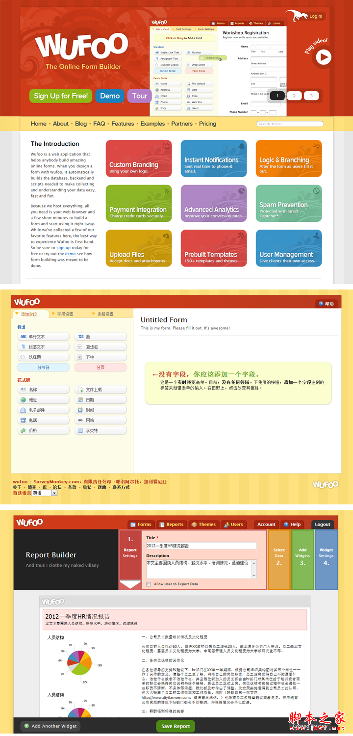 工具型网站,通常都有一些比较正式的用途,纵观此类网站觉得冷色调居多,因此初见Wufoo觉得非常特别,它大面积使用暖色系,圆角造型的弧度也偏大,看上去轻松随意。了解原因之前我们先了解下这个产品的用途和价值诉求。