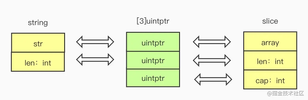 因此从底层结构上来看string可以看做[2]uintptr,[]byte切片类型可以看做 [3]uintptr