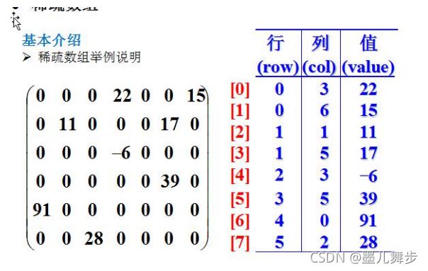 当一个数组中大部分元素为0,或者为同一个值的数组时,可以使用稀疏数组来保存该数组。